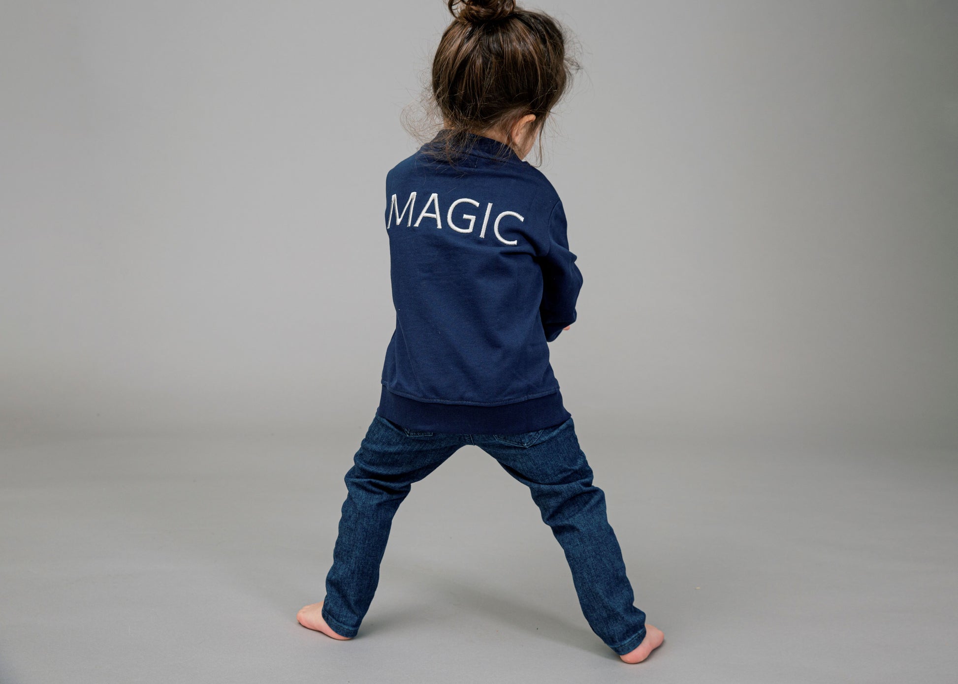 Ribbed edges at the neck, cuffs and at the bottom of the shirt. Silver-colored pushbuttons.