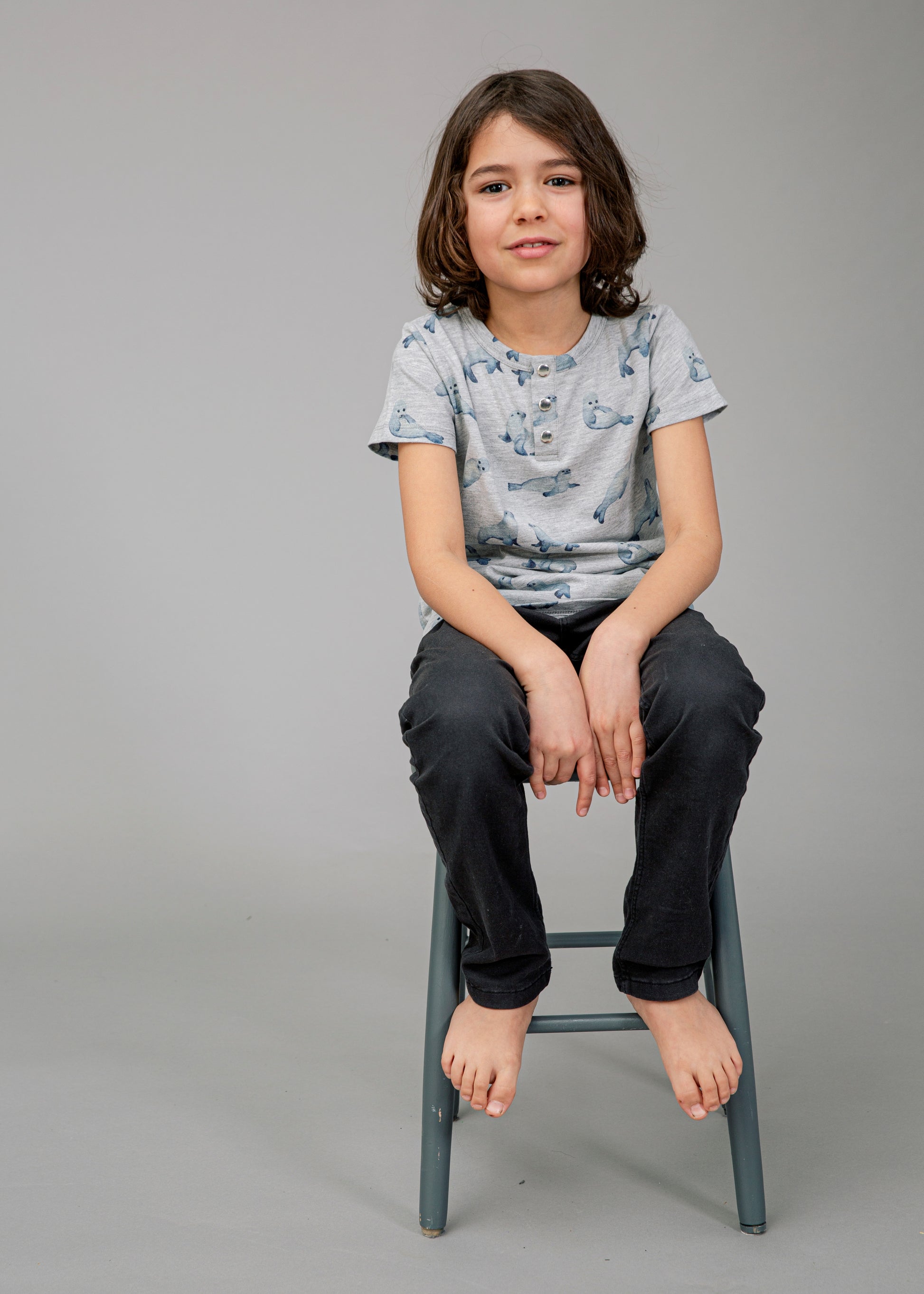 T-shirt in gray melange fabric with short sleeves and press studs on the front.