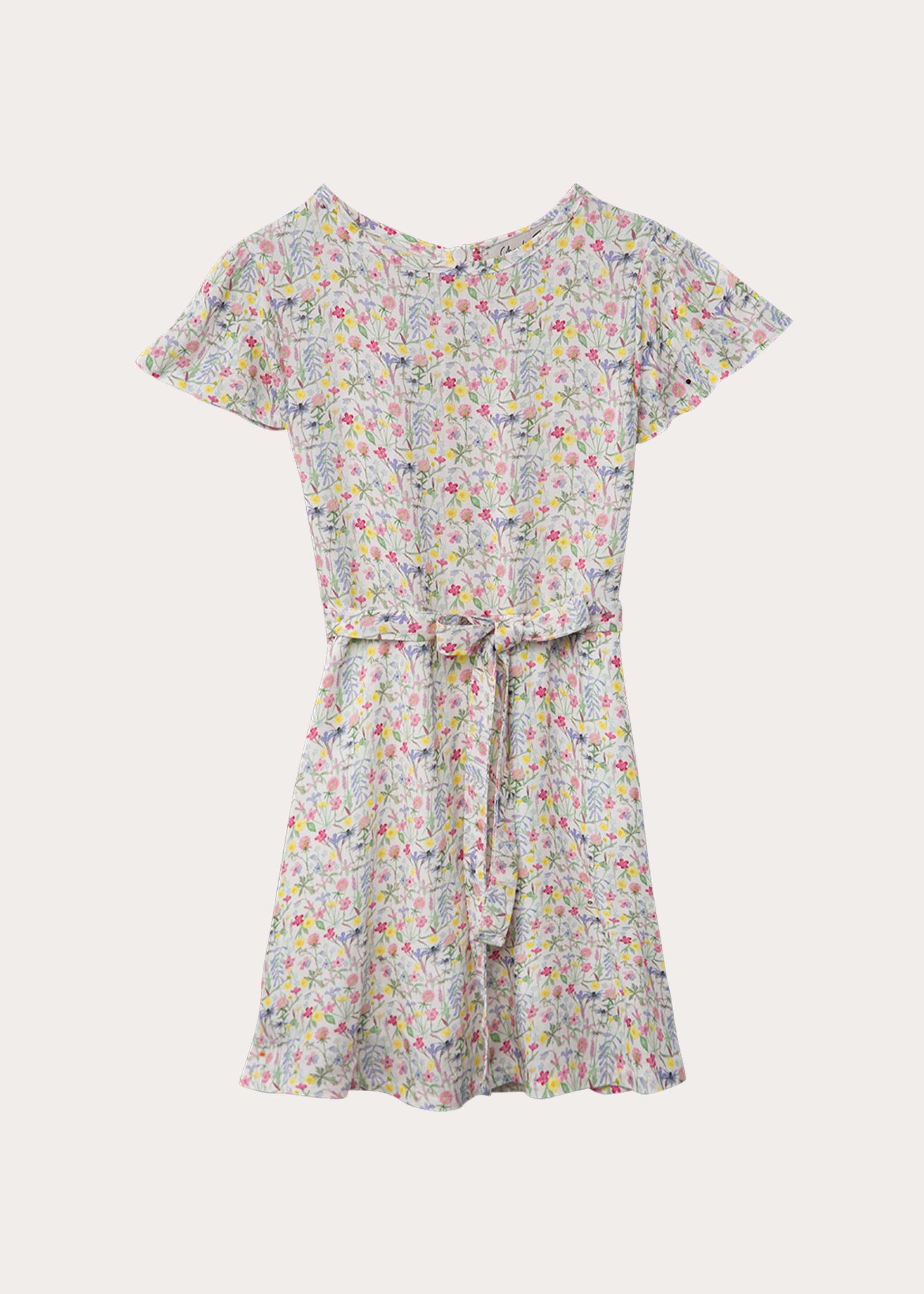 - Klänning med kort ärm med rynk på axel. En avskuren midja med knytband.